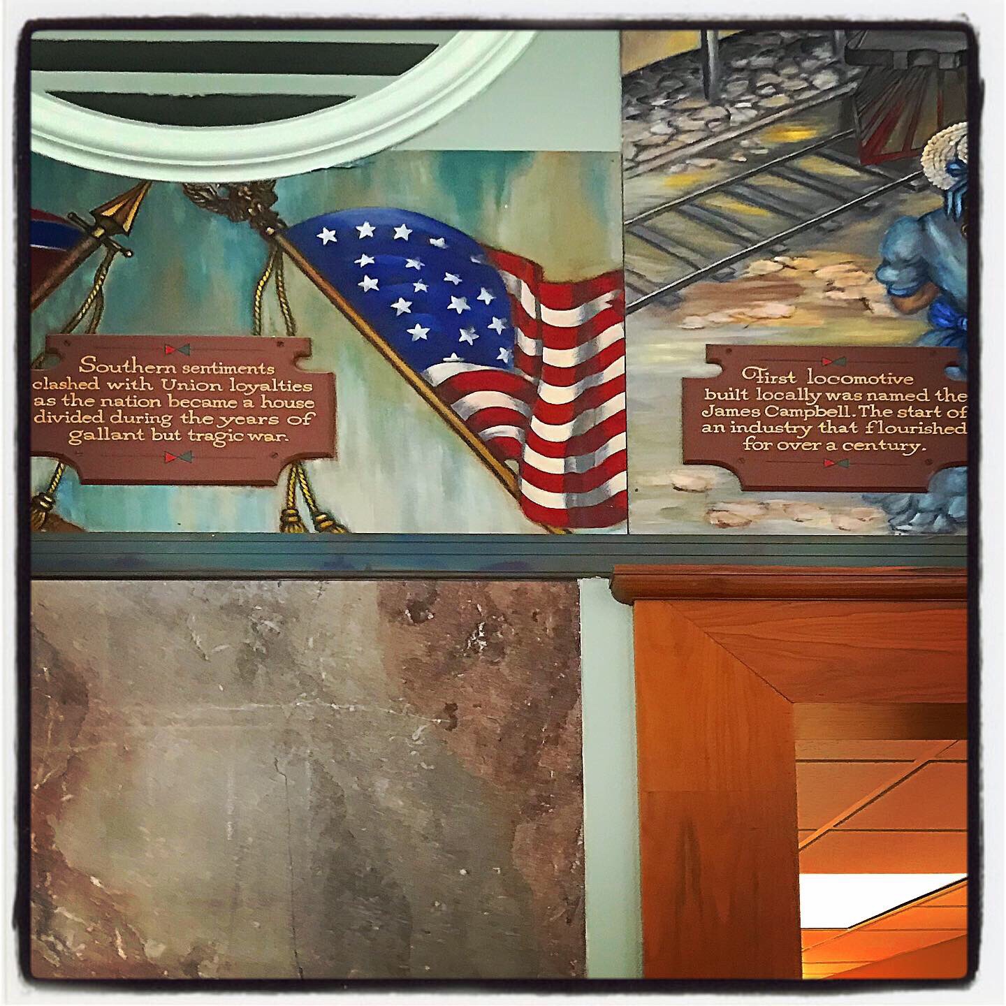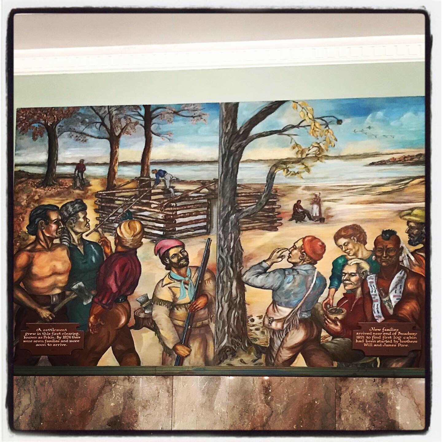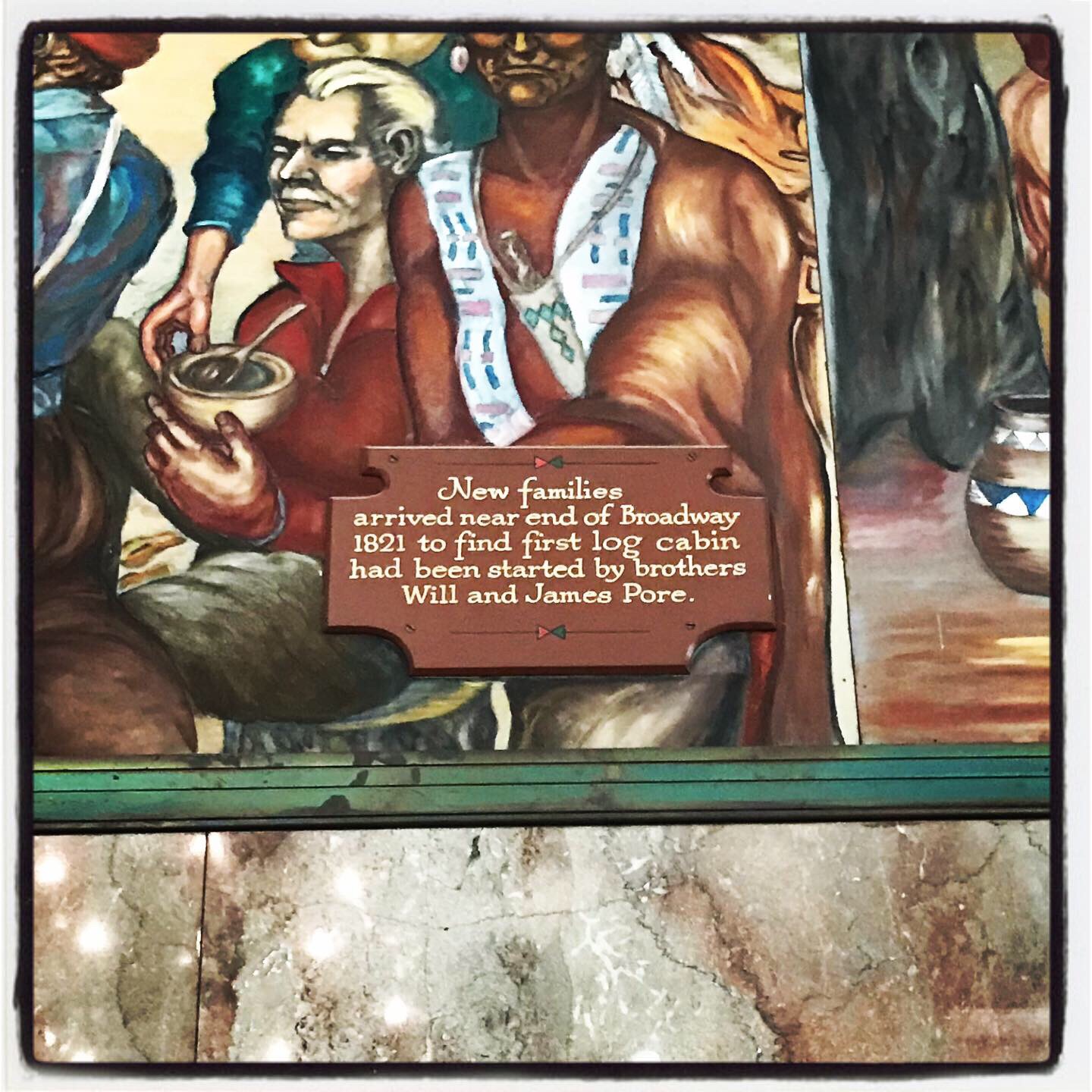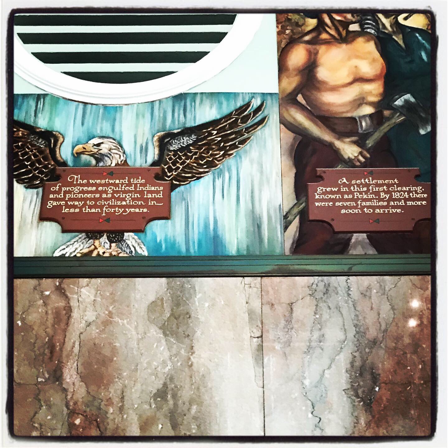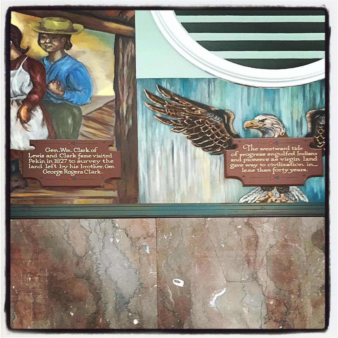 We thought we were headed for a regular Post Office building and were surprised by the signs that told us we couldn’t take our cell phones inside. As we entered we met security guards at the metal detectors! We asked for permission to take our phones in so that we could take pictures of the murals, and the guard had to call the judge to get permission for us! Crazy! But I am glad we stuck with it because the pictorial was a great overview of our city’s history.