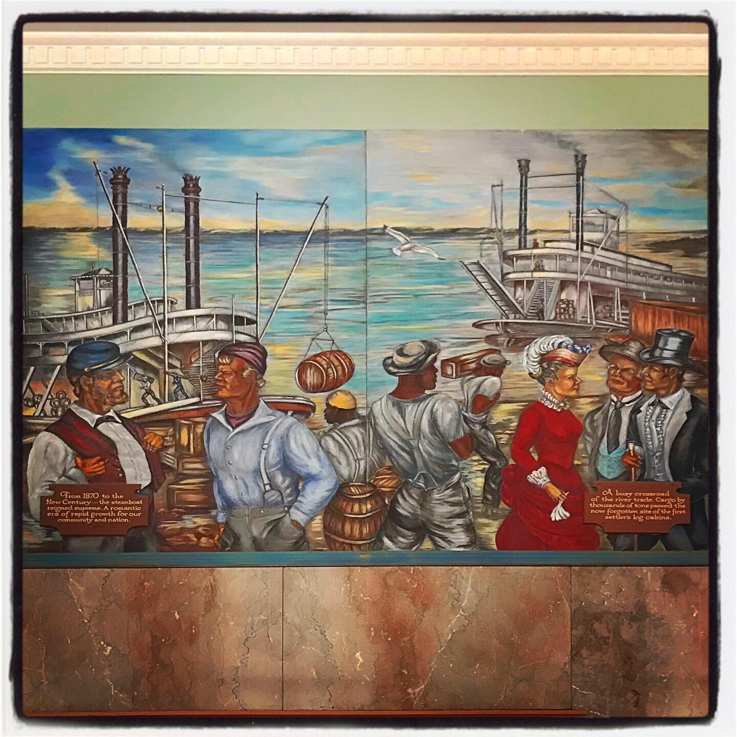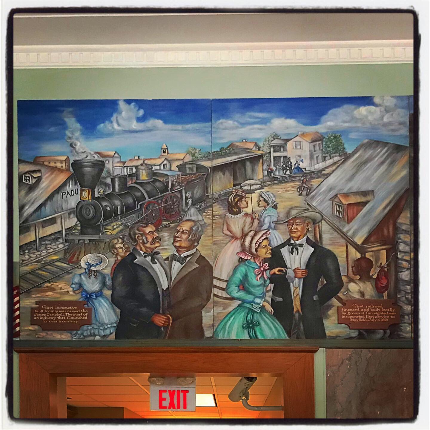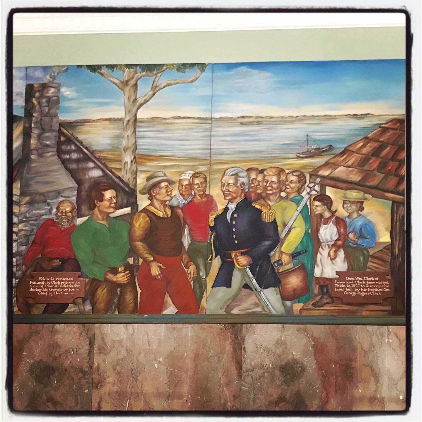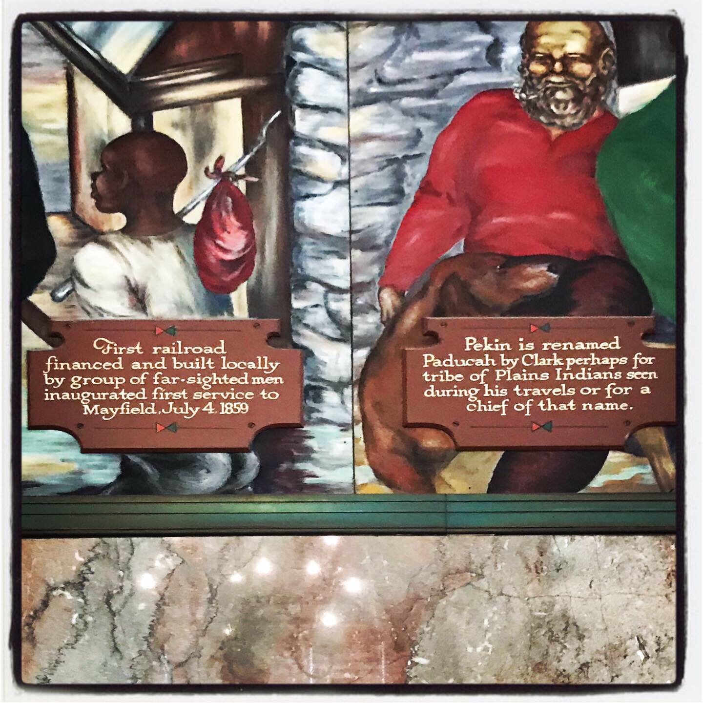 This is the Post Office and Court House building at 501 Broadway St. Paducah’s colorful history from the time of the Chickasaw Indians through the age of steamboats and steam locomotives is depicted on a mural in side the building. This history and legend of our city was painted by local artists and presented to the United States Federal Court.